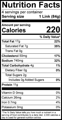 Ingredients: PORK, WATER, BEEF, PORK FAT, CONTAINS 2% OR LESS OF SALT, CORN SYRUP, NONFAT DRY MILK, SODIUM LACTATE, DEXTROSE, NATURAL SPICES, MONOSODIUM GLUTAMATE, FRESH GARLIC, PAPRIKA, SODIUM DIACETATE, FLAVORINGS, SODIUM ERYTHORBATE, SODIUM NITRITE.