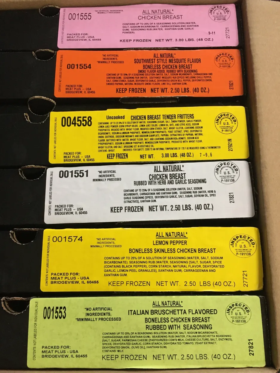 Each breast is individually vacuum sealed for a year of freshness and shipped in dry ice. You will receive 7-11 breasts of each flavor. The Fritters will not be individually vacuum sealed.